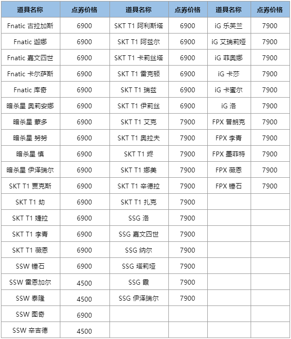 限时销售皮肤详见文末附表:“ 经典冠军战队皮肤” 列表